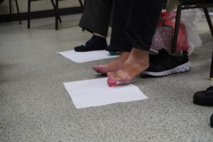 紙のメジャーを使って自分で足のサイズを測ったり、スーパーボールを使って足裏のエクササイズをしたりしました。