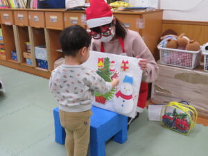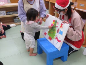 乳児はひよこ組・りす組で集まって、お楽しみ会がありました🎅クリスマスツリーのパネルシアターで子ども達にも飾りをつけてもらいました!