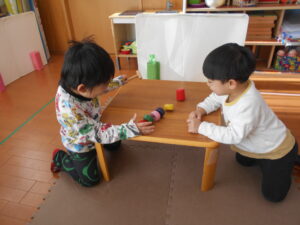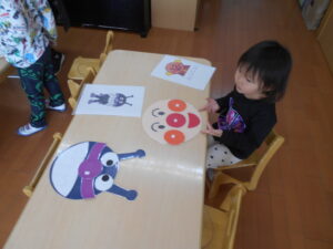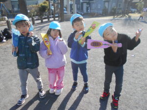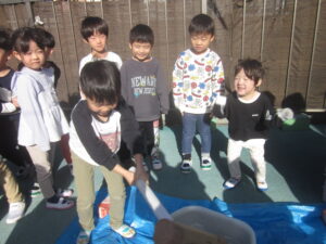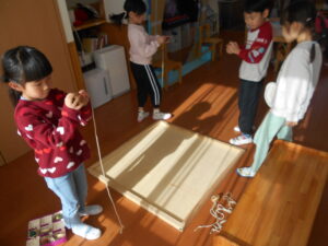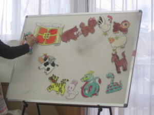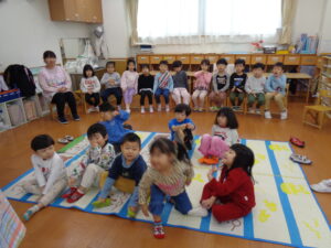 2026年!新しい年が始まりました。今週は、お正月遊び週間ということで、幼児3クラスが集まって、皆で「明けまして おめでとうございます。」と元気に新年の挨拶をしました。干支の話で「十二支の始まり」というパネルシアターを見て今年は7番目の「午年」という事を知りました。その後、紙皿で自分のコマを作ったり、こま回しや福笑い・羽根つき・ダルマ落としなどのお正月遊びを楽しみました。また、次の日には、お餅つきごっこを行ない楽しそうに「ぺったんこ!ぺったんこ!」と言う掛け声が響いていました。