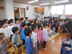 子どもたちと、退職・異動する職員・退園する子どもたち、最後のお別れ会です。今までお世話になった先生方に幼児クラスからプレゼント。退園する子には、クラスの子からプレゼントを渡しました。そして、心をこめて「ありがとうのはな」を歌いました。子どもたちが作ったアーチでお別れです。みなさん、お体に気を付けて頑張ってくださいね。