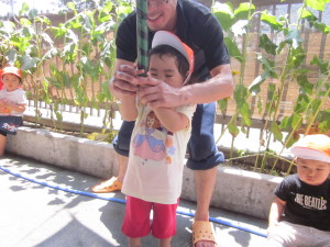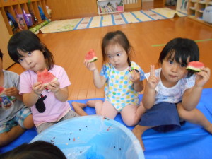 この夏一番の猛暑となった今日は、乳児・幼児にわかれて、みんなですいか割りを楽しみました。実は4歳児がすいかの栽培をしていて、可愛い💛すいかが3個でき、収穫しました。食べるのは・・・・なので飾っています。幼児クラスは「前・前・・・」「一歩、後ろ!!」「せ~の!!」と盛り上がりました。乳児クラスは、たたいていいの?みたいな雰囲気でしたが、楽しそうでした。