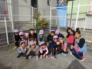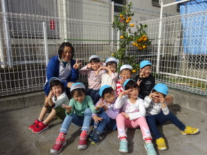 昨年、植えた園庭のみかんの実がきれいに色づき収穫を迎えました。4・5歳児がみかん狩りをしました。はさみを使わないで、みかんの実をくるくると回すとみかんが収穫できます。みかんに鼻を近づけて「いい、におい~」と香りまで楽しみました。みかんを半分にして、2歳児から【だいしの里みかん】を味わいました。