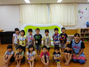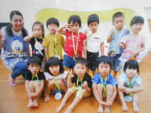 夏の暑さを忘れてしまいそうな、お天気でしたが今日はプール閉めでした。幼児クラス中心に行いました。本来ならプールで一人ひとりの泳ぎを披露する予定でしたがそれも出来ず・・・しかし室内にボールプールを用意して泳ぎを披露!!目標を発表し、泳ぎを披露、園長先生からメダルを首にかけてもらい、嬉しそうな子、照れてしまう子、表情は様々でした。そして、みんなでカルピスを飲みました。