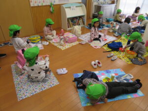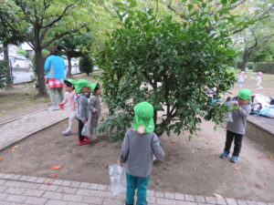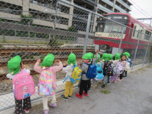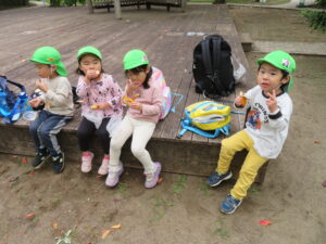 24日に遠足へ行ってきました。手作りの虫探し用カメラと拾ったどんぐりを入れる袋を持って いざ、出発!最初の目的地、田町遊歩道で電車を見送り、田町ふれあい公園で虫探しとどんぐり拾いを楽しんできました。途中のおやつタイムでお菓子をほおばりニコニコ顔でした。楽しみにしていたお弁当は、あいにくの雨でお部屋の中となってしまいましたが、「おいしぃ~♡!」ぃと大満足でした。