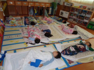 昨日のお天気が一変、今日は真っ青な空の下4才・5才の遠足があり、殿町第二公園に行ってきました。飛行機やモノレールを見ながらビンゴゲームをしたり走り回ったりと、とっても楽しい遠足でした。帰ってくるのに疲れた子どもたちでしたが、神社で愛情たっぷり手作りお弁当を食べるために頑張り・・・みんな美味しそうにほおばって元気モリモリに・・・朝、早くからのお弁当作りお疲れ様でした。今は、みんなぐっすり、お昼寝タイムです。